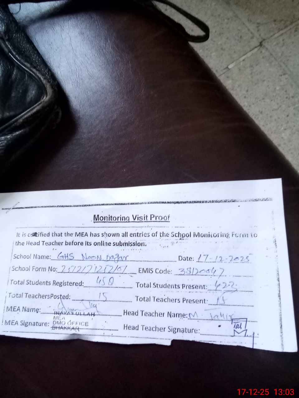 | Attendance Register | Head Teacher | MEA with School | Visit Proof |