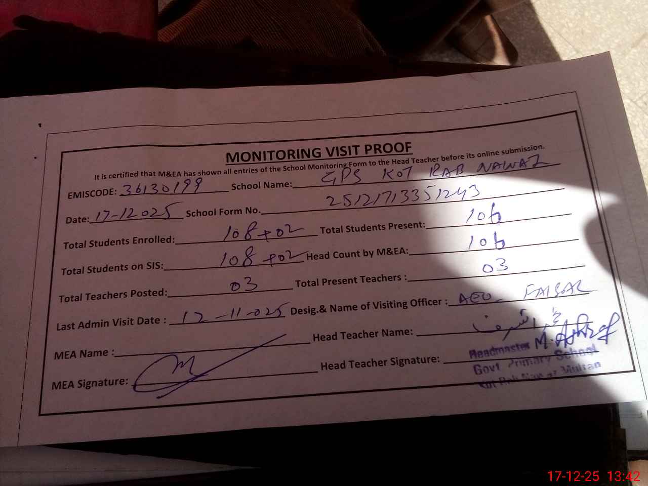 | EMIS Code: 36130199 | Name of School: GPS KOT RAB NAWAZ P/O JHOKE LASHKAR PUR | |||