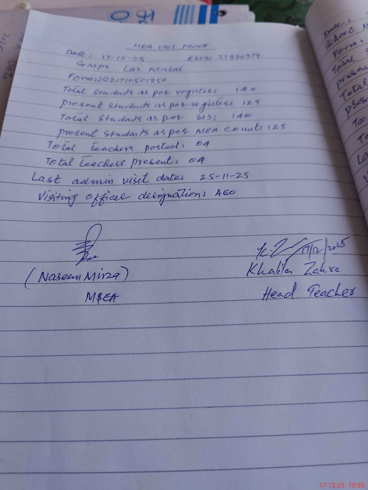 | Attendance Register | Head Teacher | MEA with School | Visit Proof |