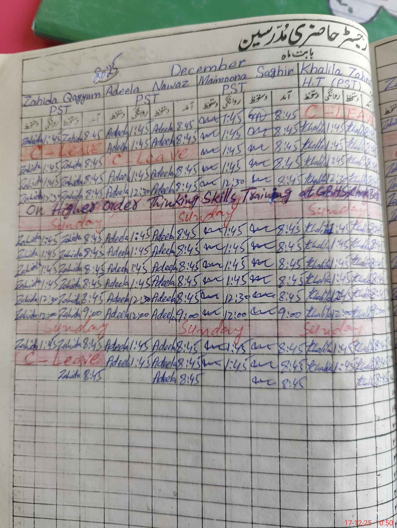 | CNIC | Full Name | Designation | R/C | Absence During Last Calender Month |