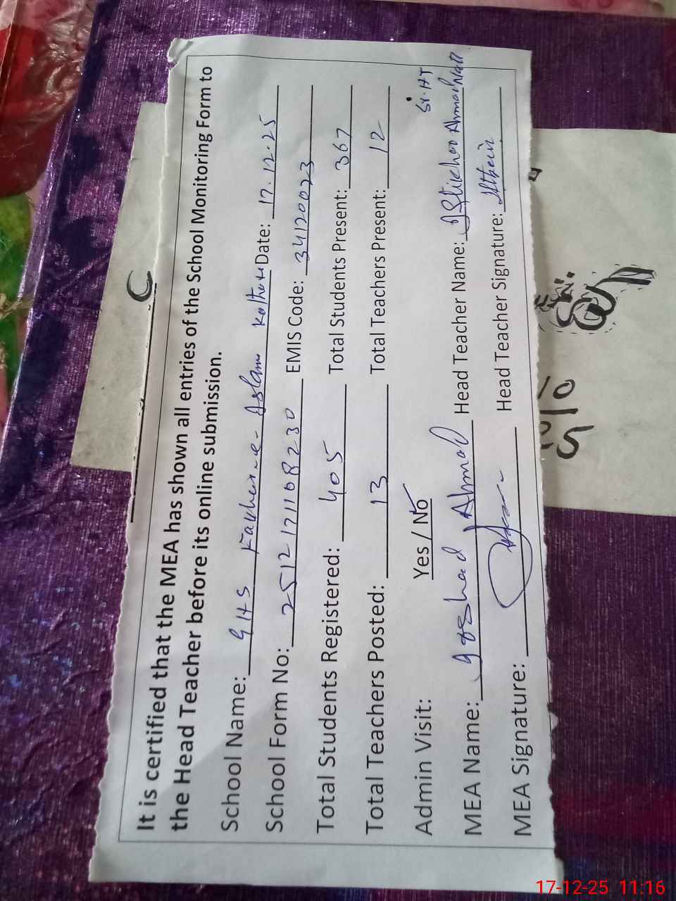 | EMIS Code: 34120023 | Name of School: GHS FAKHAR-E-ISLAM KATHORE KALAN | |||