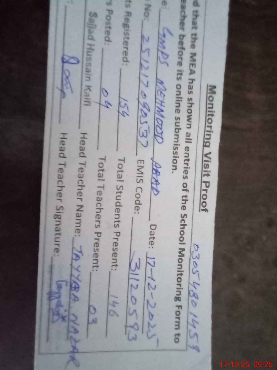 | EMIS Code: 31120593 | Name of School: GMPS MEHMOOD ABAD | |||