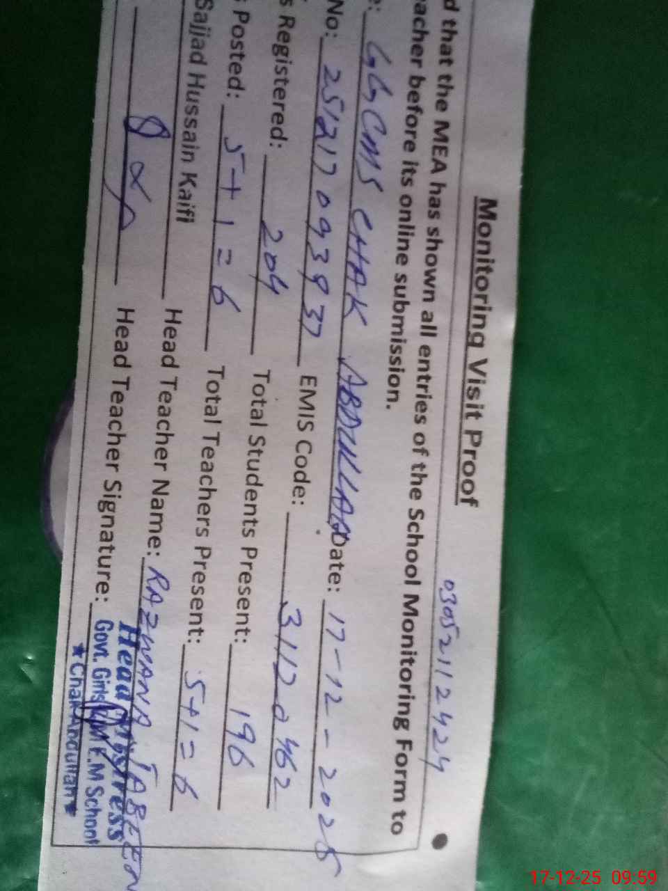 | EMIS Code: 31120462 | Name of School: GGCMS CHAK ABDULAH | |||
