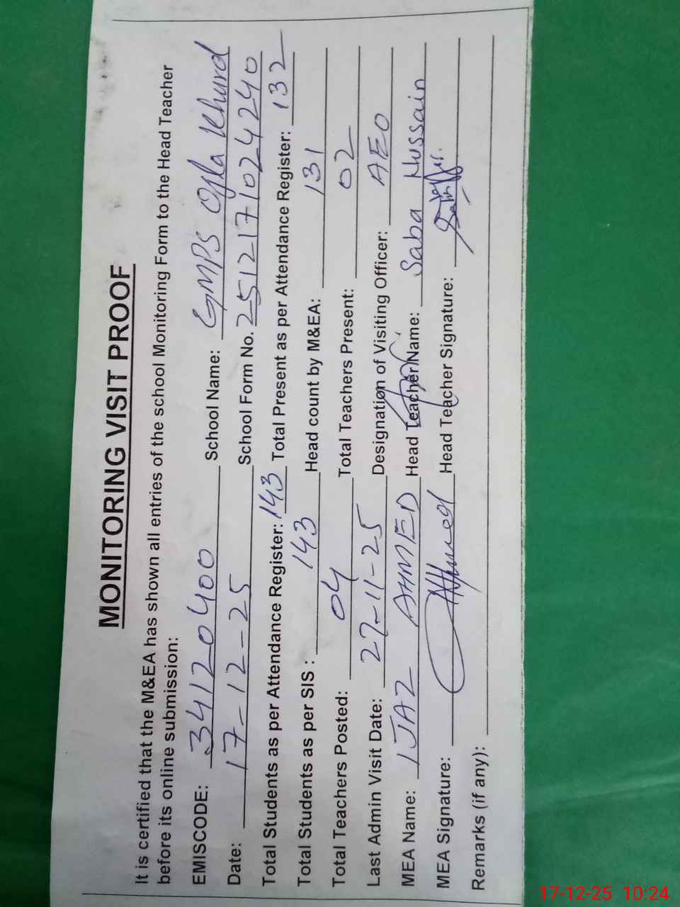 | Attendance Register | Head Teacher | MEA with School | Visit Proof |