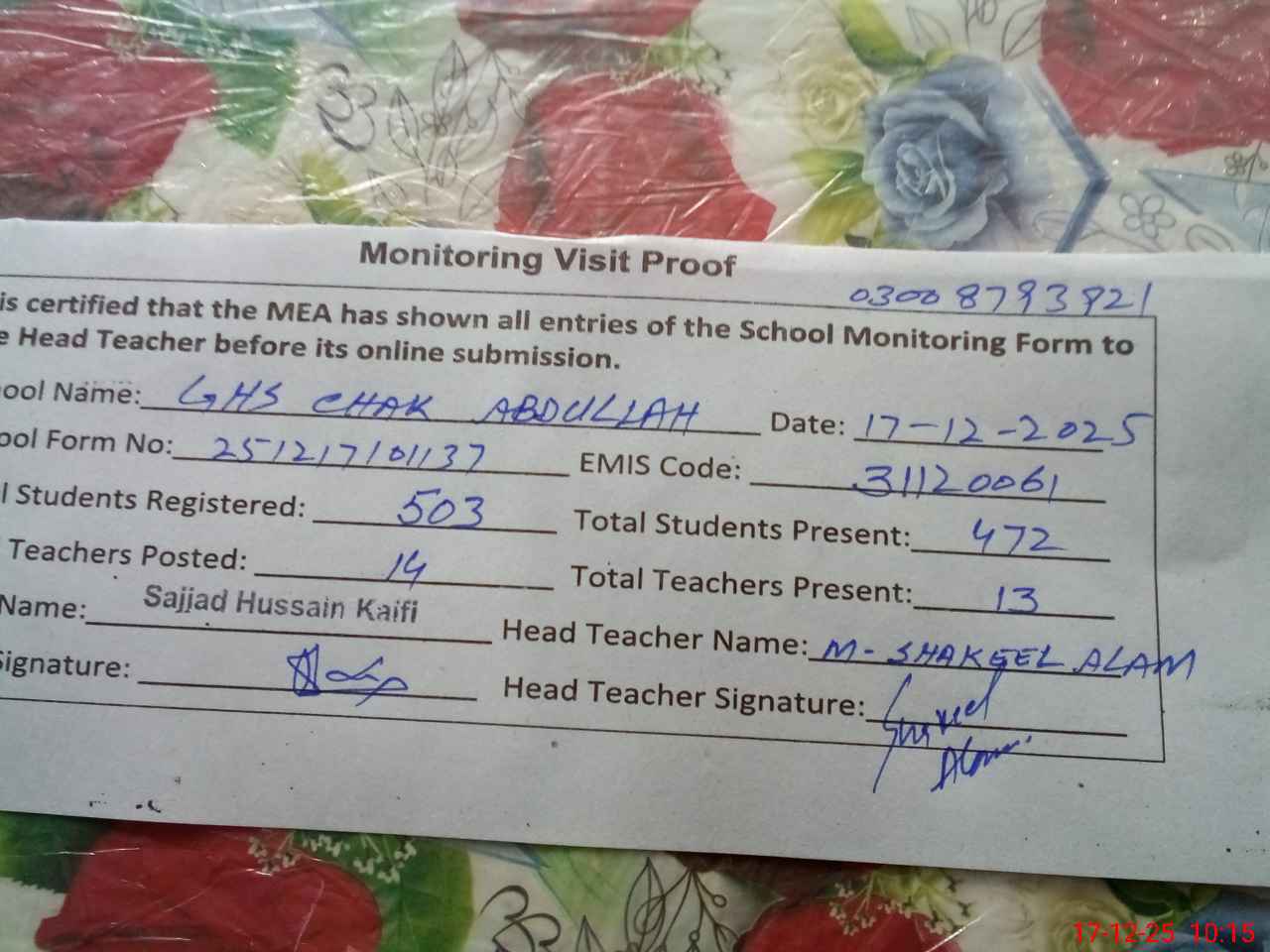 | EMIS Code: 31120061 | Name of School: GHS CHAK ABDULLAH | |||