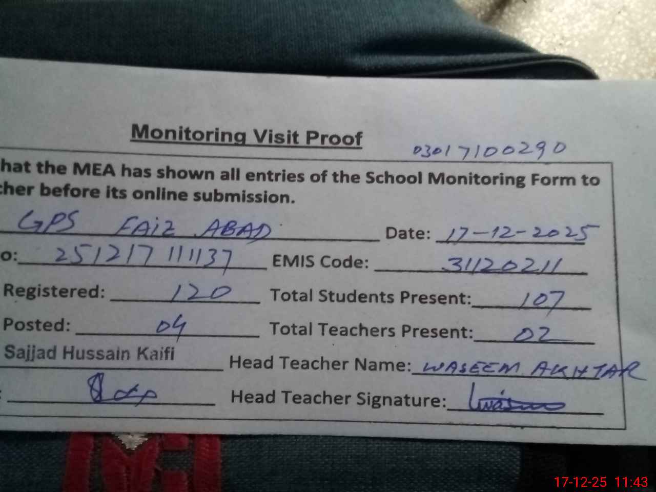 | Attendance Register | Head Teacher | MEA with School | Visit Proof |