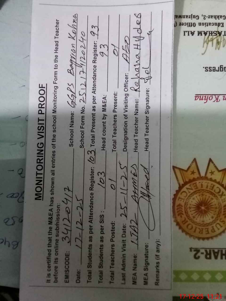 | EMIS Code: 34120417 | Name of School: GGPS BAGARIAN KOHNA | |||