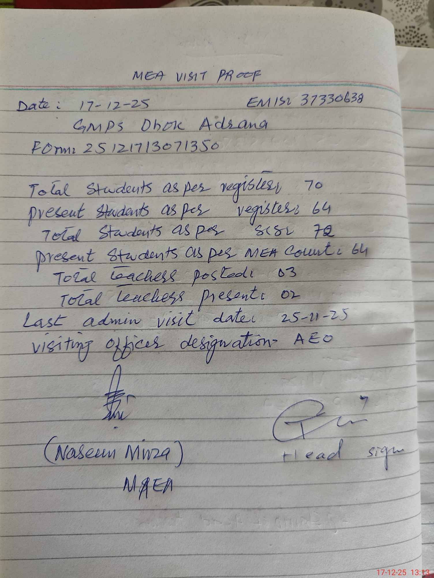 | EMIS Code: 37330638 | Name of School: GMPS DHOK ADRANA | |||