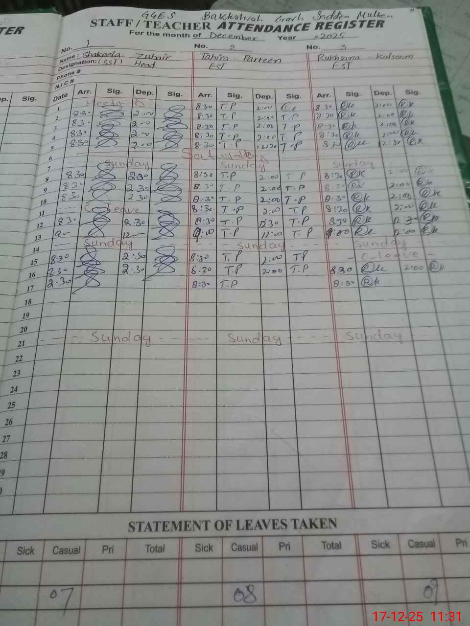 | CNIC | Full Name | Designation | R/C | Absence During Last Calender Month |