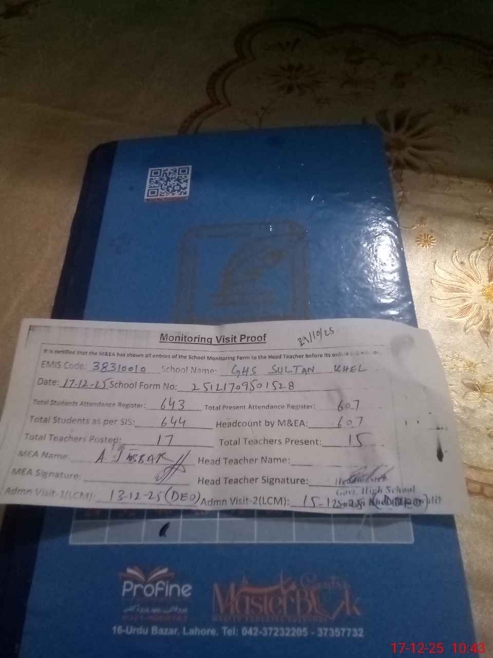 | Attendance Register | Head Teacher | MEA with School | Visit Proof |