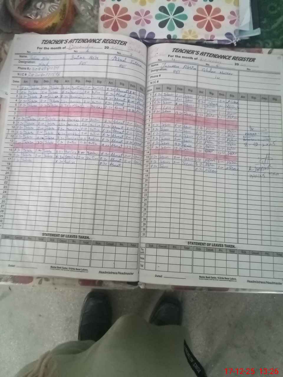 | CNIC | Full Name | Designation | R/C | Absence During Last Calender Month |
