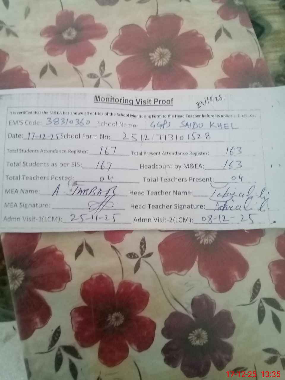 | Attendance Register | Head Teacher | MEA with School | Visit Proof |