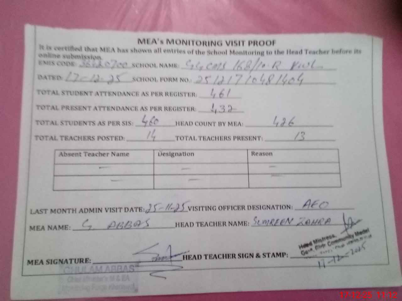 | Attendance Register | Head Teacher | MEA with School | Visit Proof |