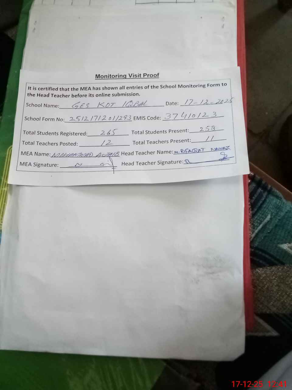 | EMIS Code: 37410123 | Name of School: GES KOT IQBAL | |||