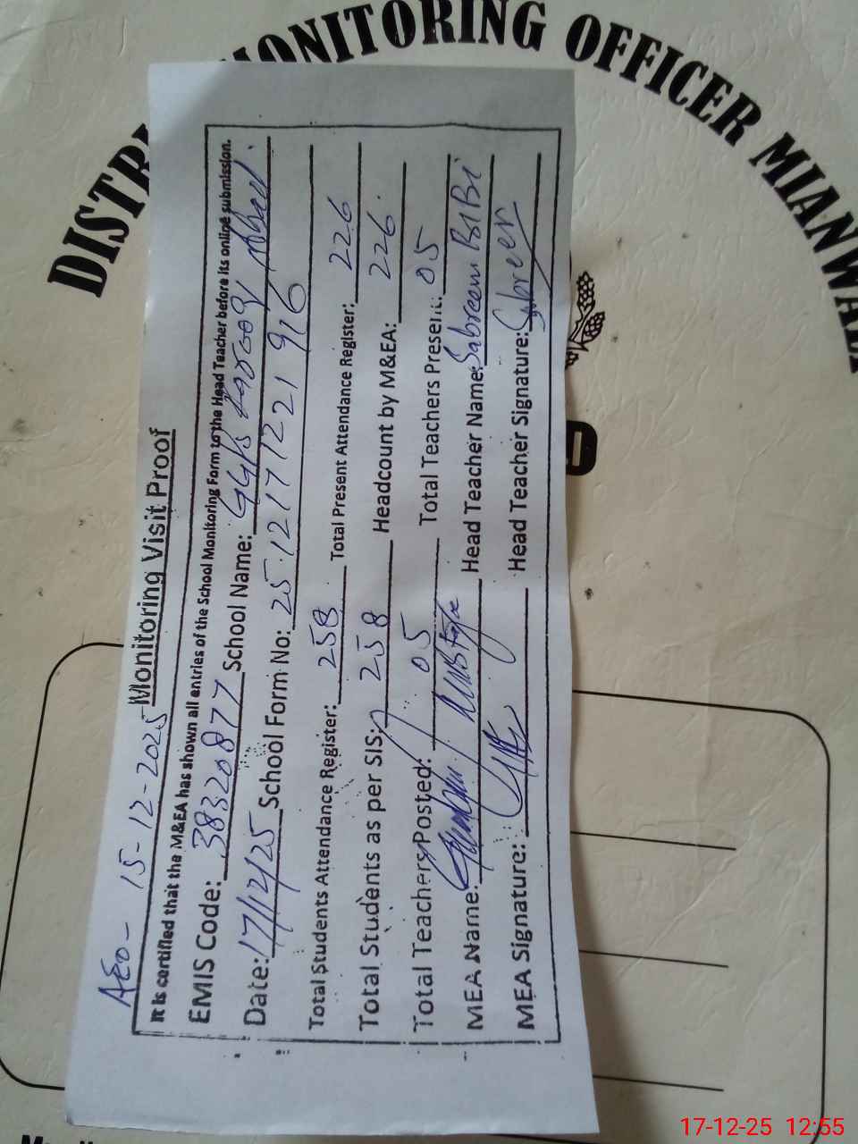 | Attendance Register | Head Teacher | MEA with School | Visit Proof |