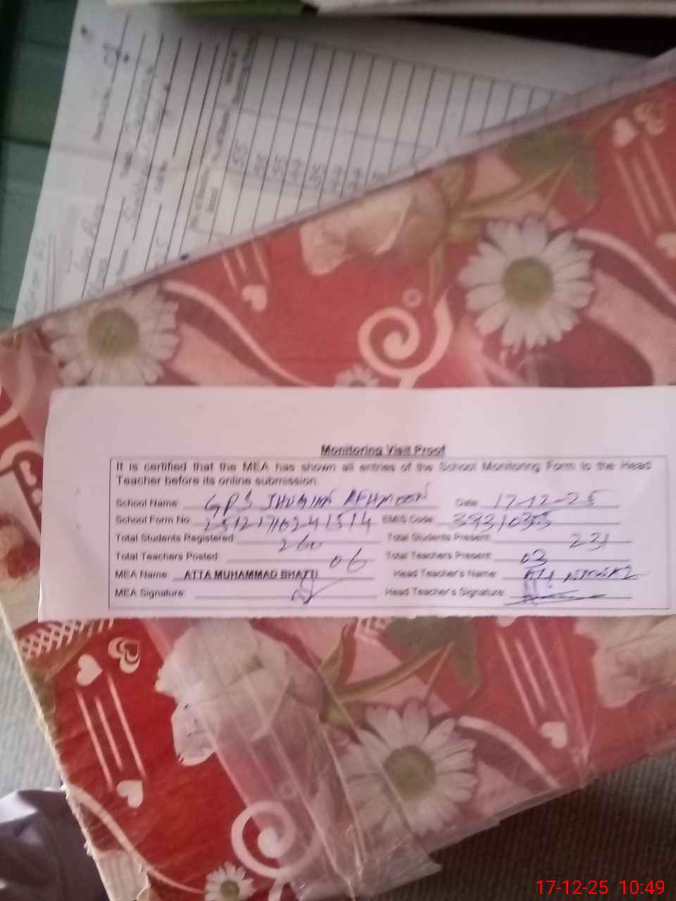 | Attendance Register | Head Teacher | MEA with School | Visit Proof |