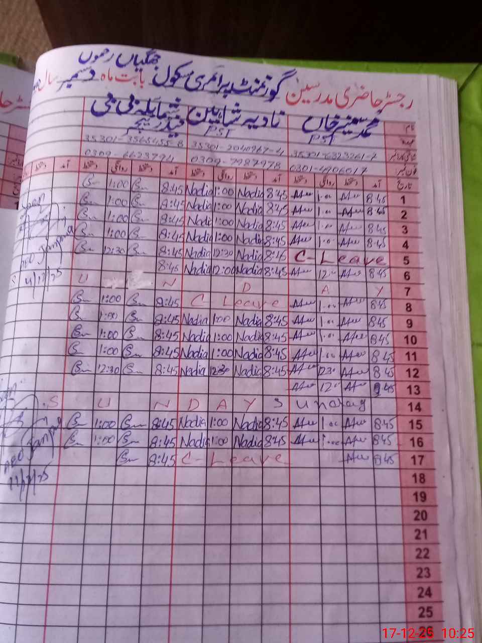 | CNIC | Full Name | Designation | R/C | Absence During Last Calender Month |