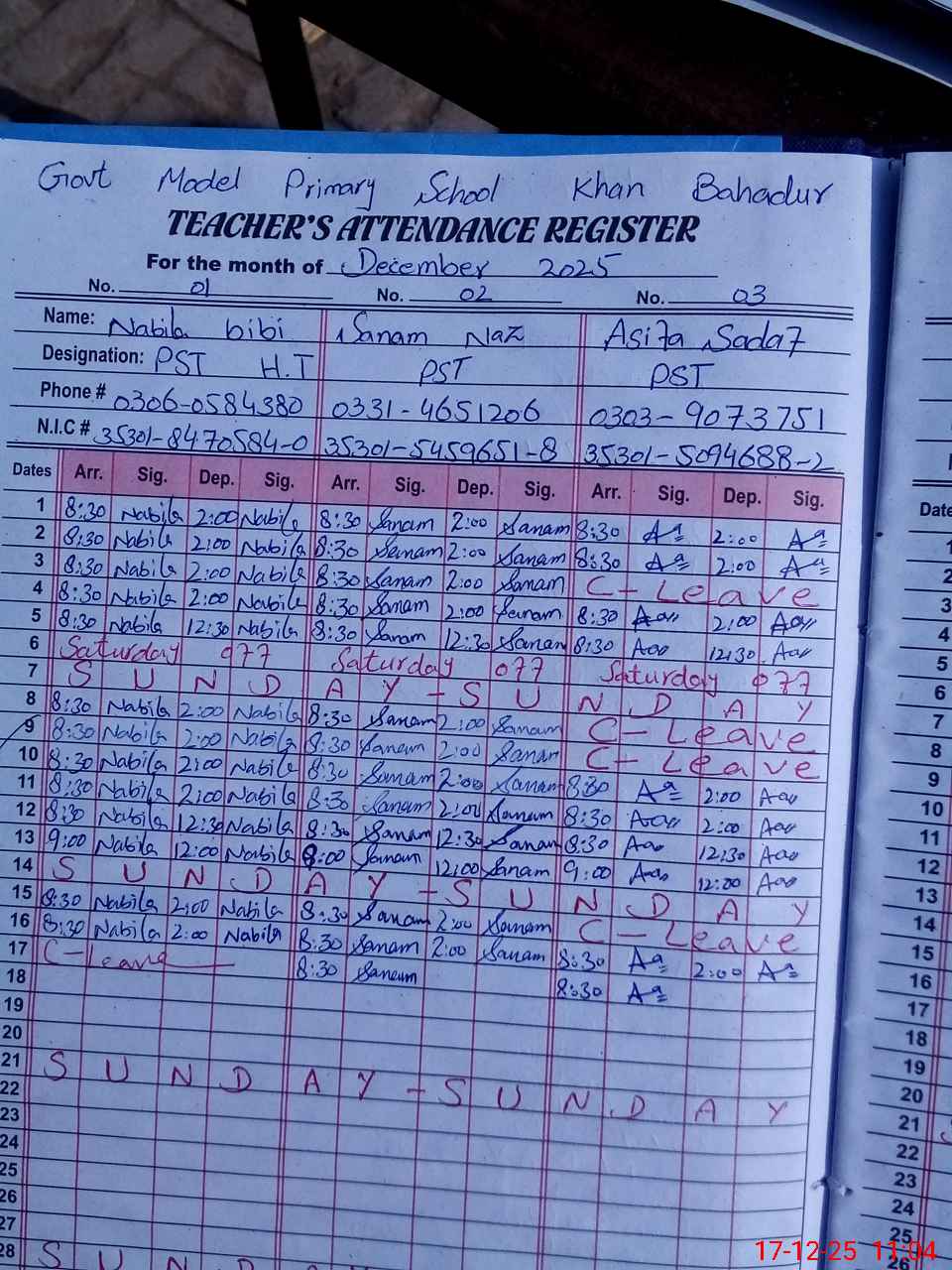 | CNIC | Full Name | Designation | R/C | Absence During Last Calender Month |