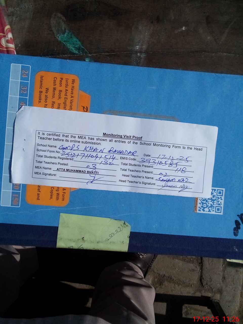 | Attendance Register | Head Teacher | MEA with School | Visit Proof |