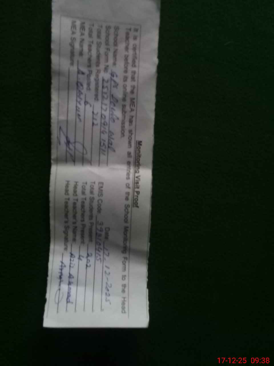 | Attendance Register | Head Teacher | MEA with School | Visit Proof |