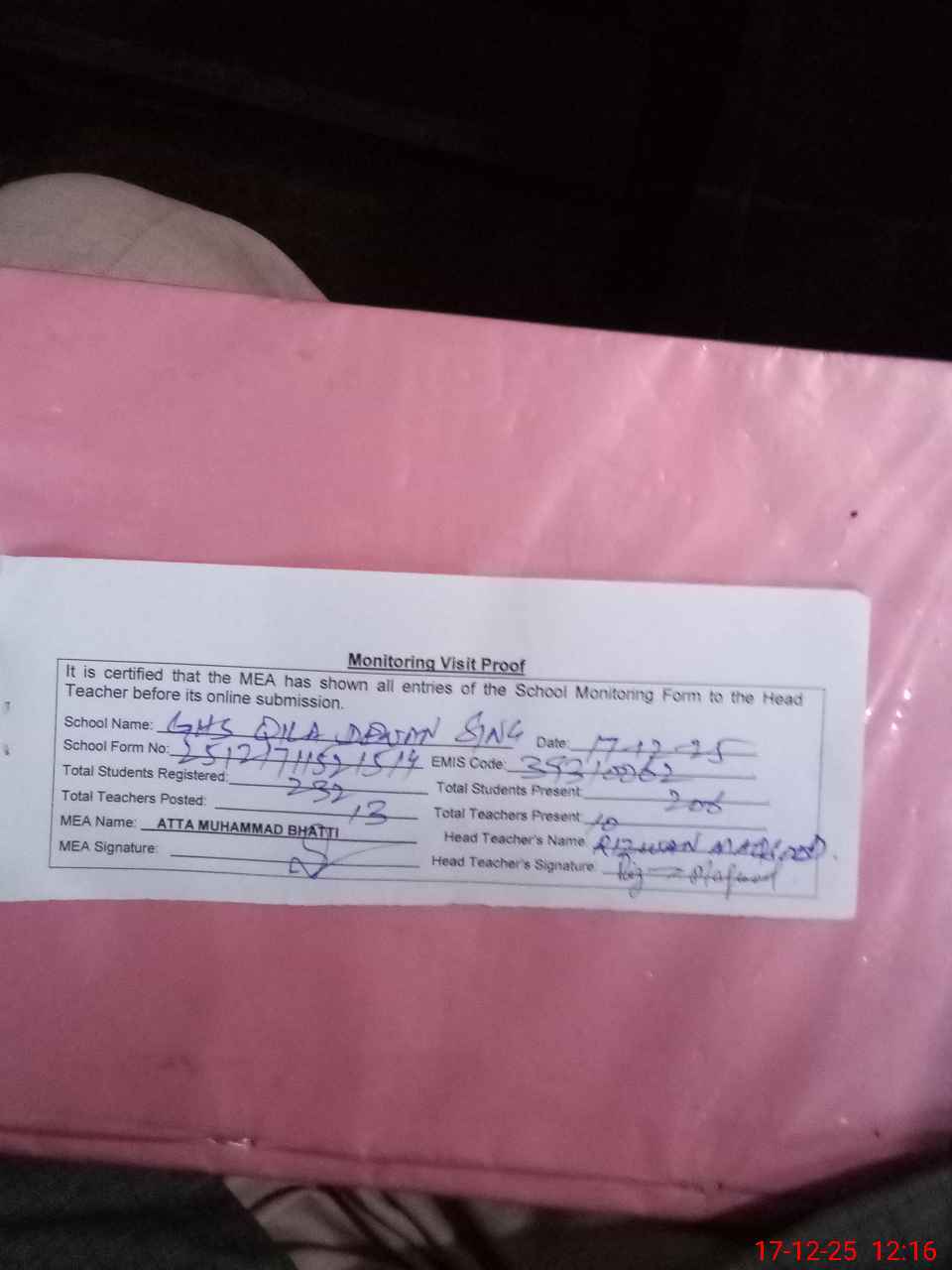 | EMIS Code: 39310062 | Name of School: GHS QILA DEWAN SINGH | |||