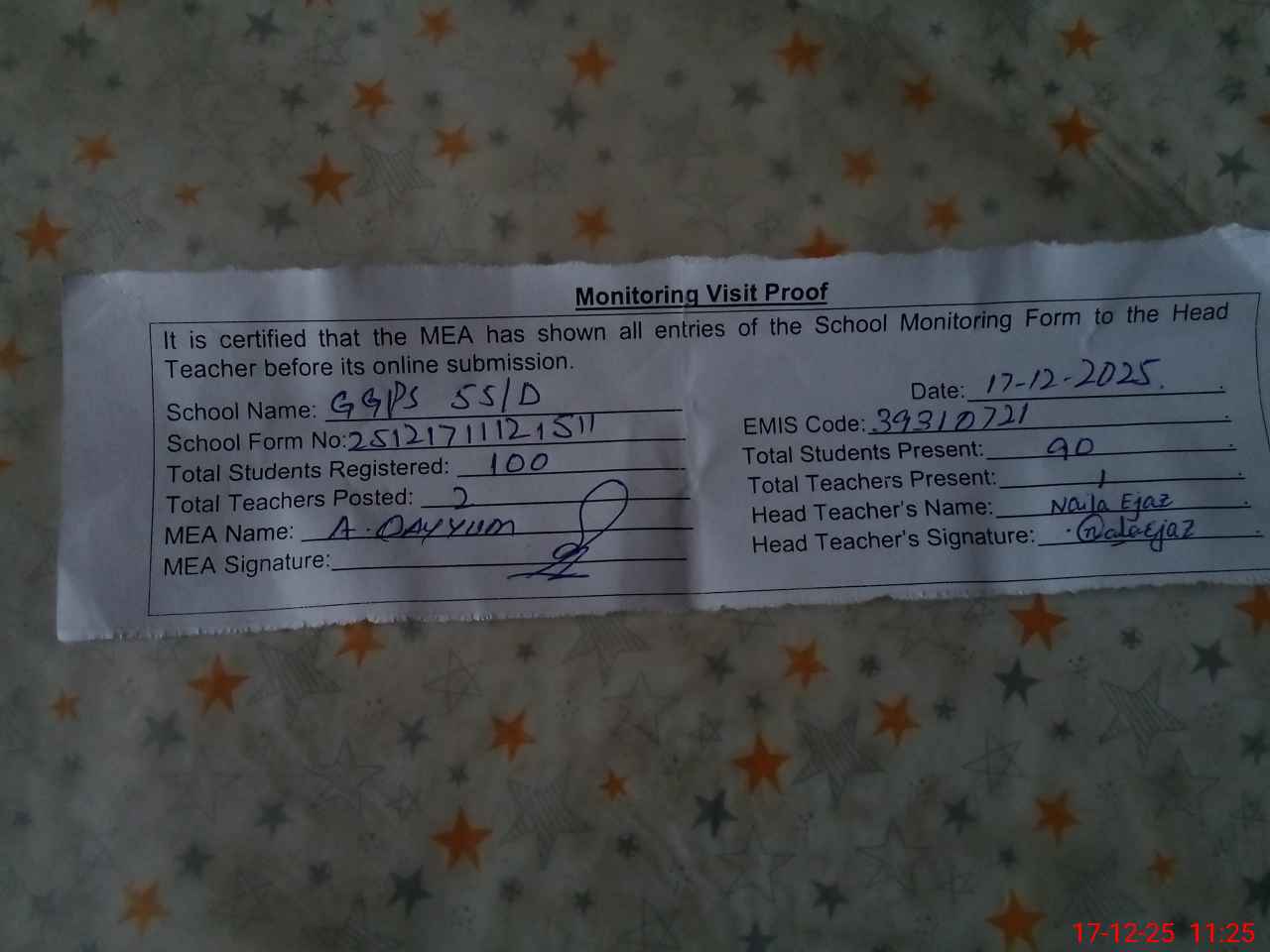 | Attendance Register | Head Teacher | MEA with School | Visit Proof |