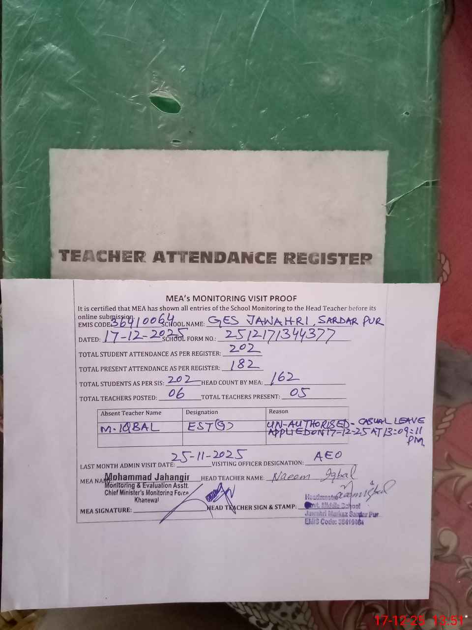 | Attendance Register | Head Teacher | MEA with School | Visit Proof |