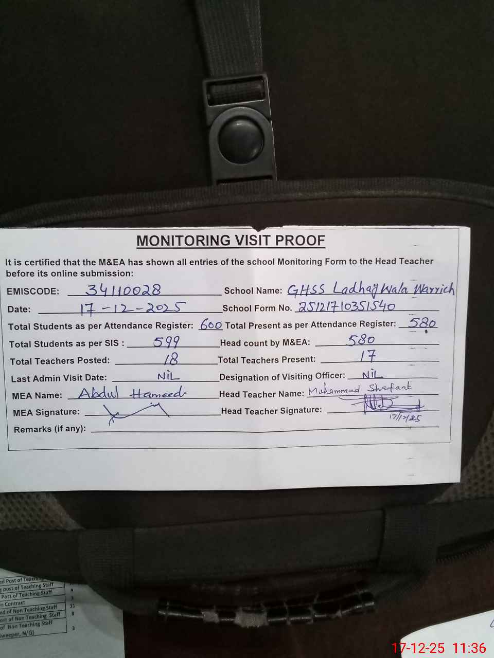 | Attendance Register | Head Teacher | MEA with School | Visit Proof |