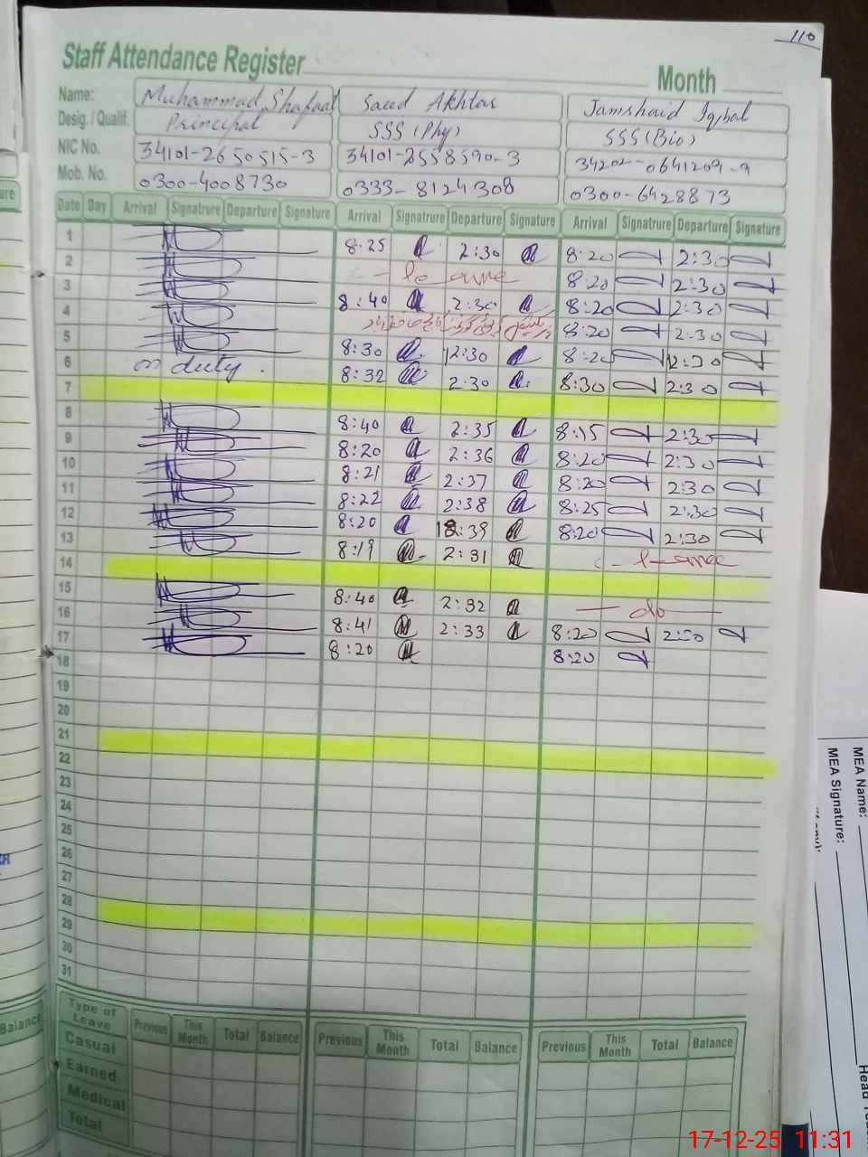 | CNIC | Full Name | Designation | R/C | Absence during last cal. month |