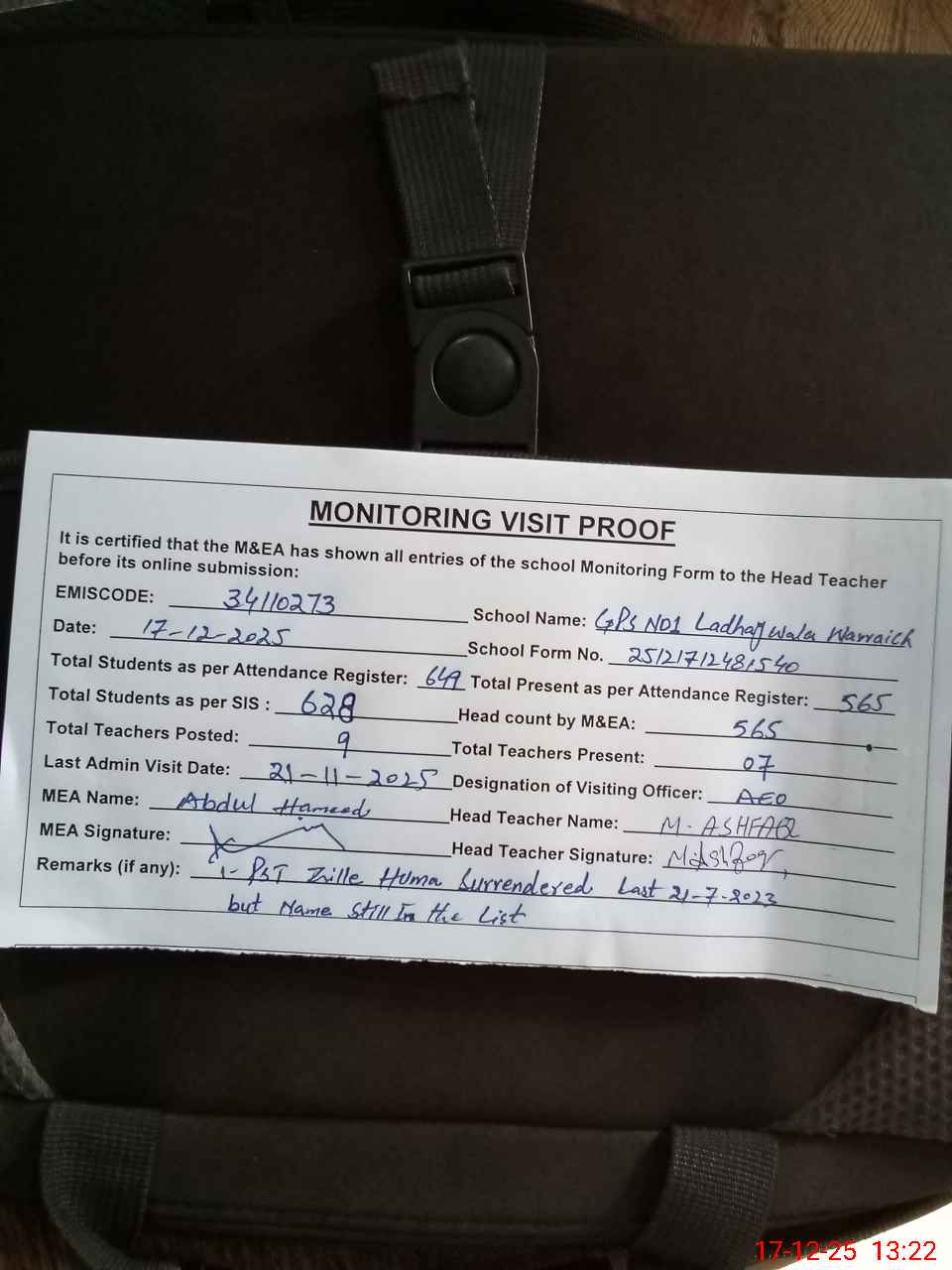 | EMIS Code: 34110273 | Name of School: GPS LADHAY WALA WARRAICH NO.1 | |||