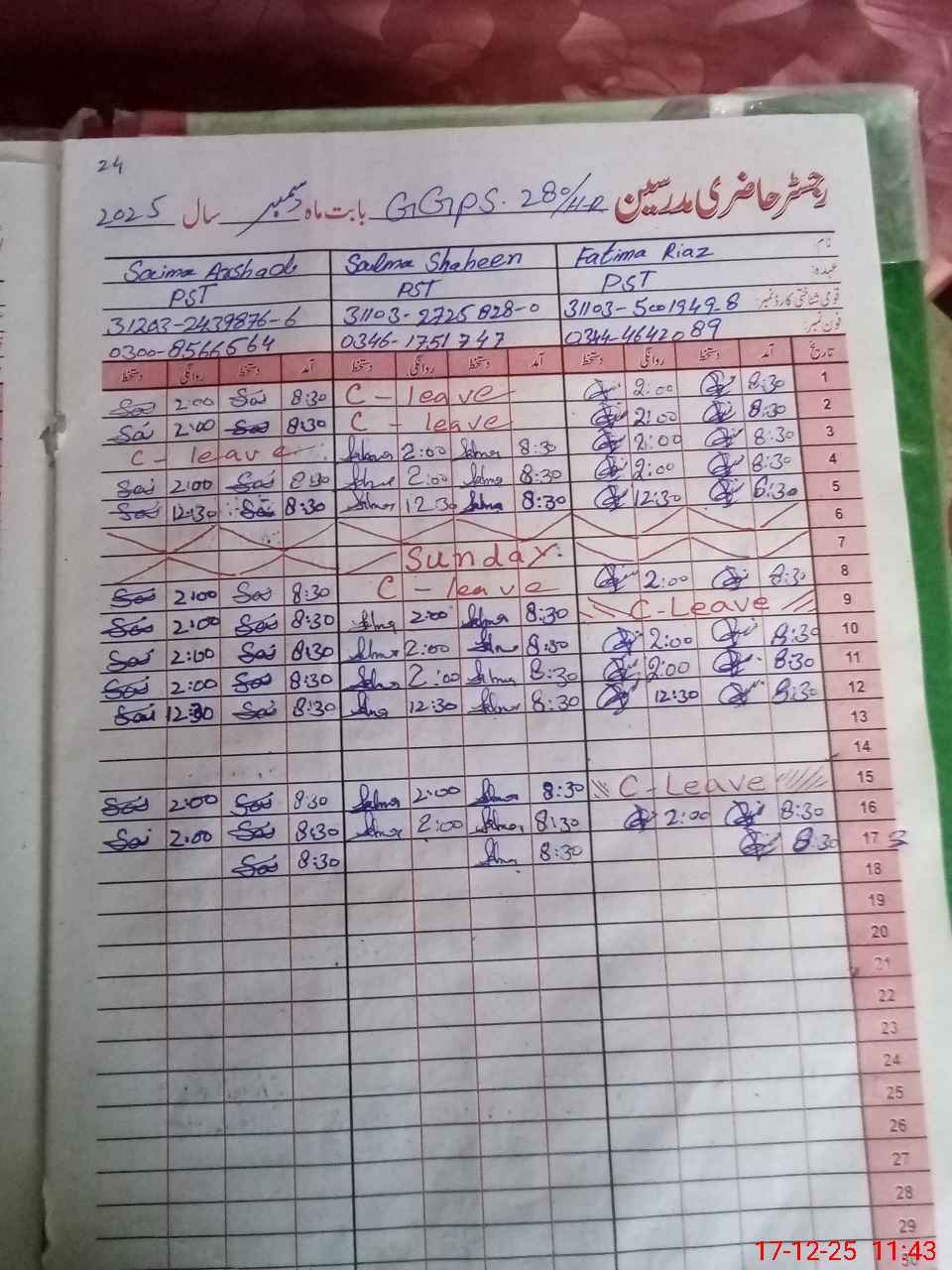 | 31**** | Sh**** Pe**** | EST Urdu | Regular | 1 | 0 | 0 | 0 | 0 | 0 | 0 | 0 | 1 | Absent (Un-Authorized) |