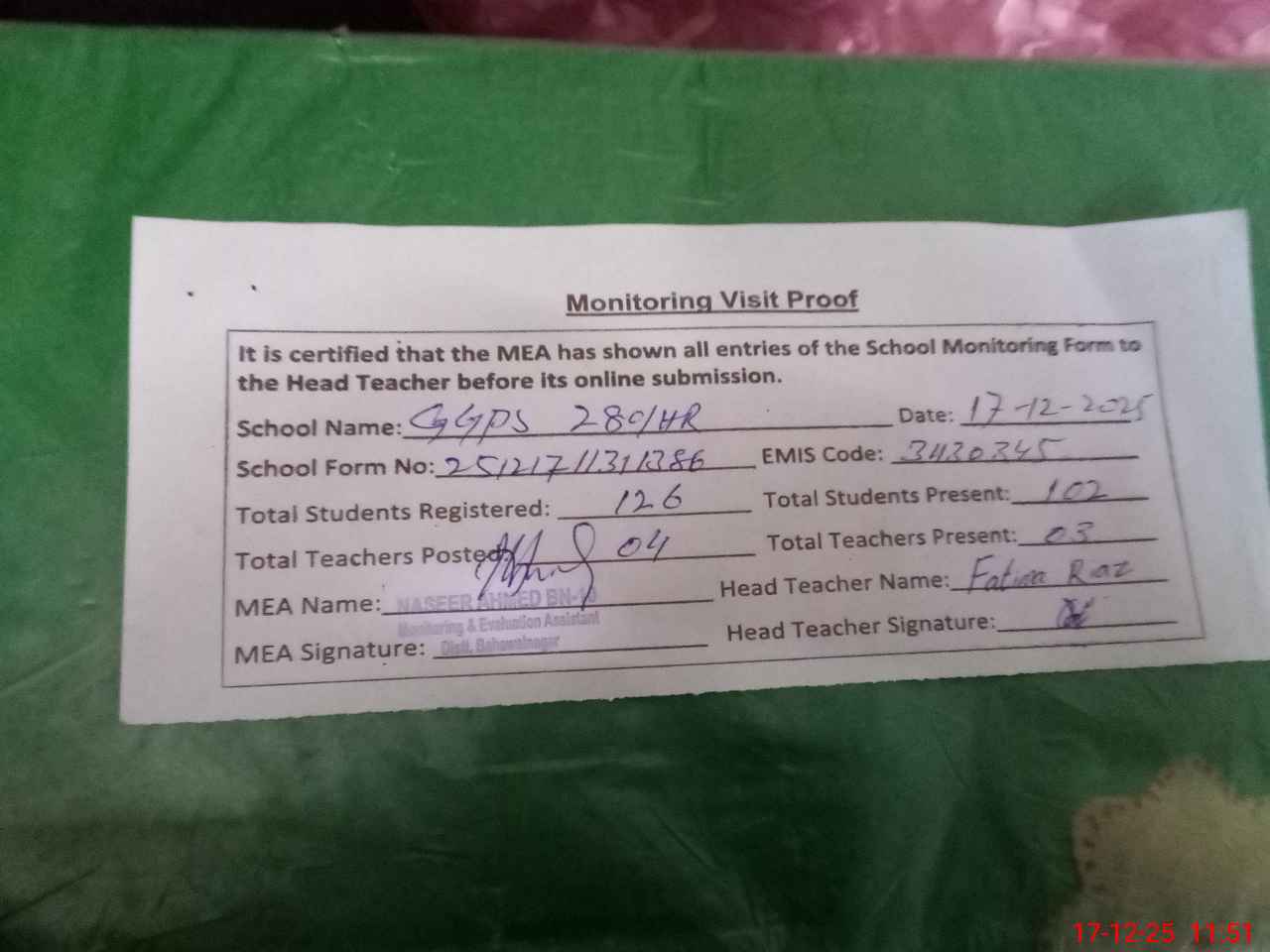| EMIS Code: 31130345 | Name of School: GGPS CHAK NO 280 HR | |||