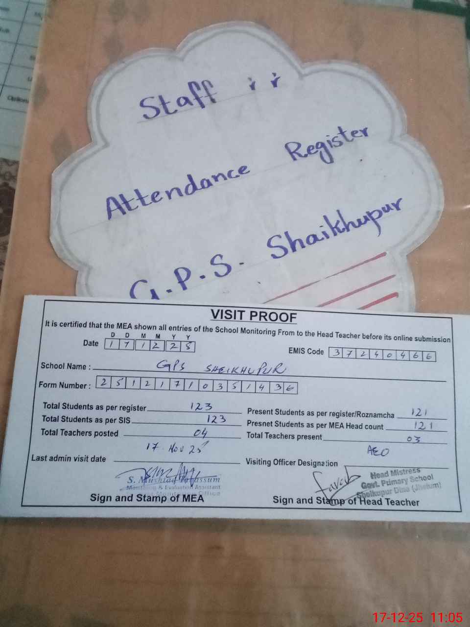| Attendance Register | Head Teacher | MEA with School | Visit Proof |