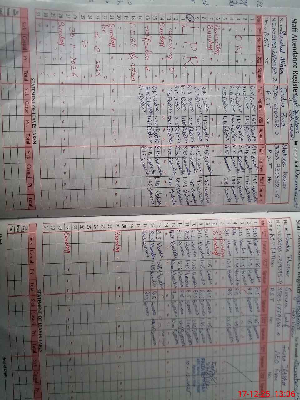 | CNIC | Full Name | Designation | R/C | Absence During Last Calender Month |