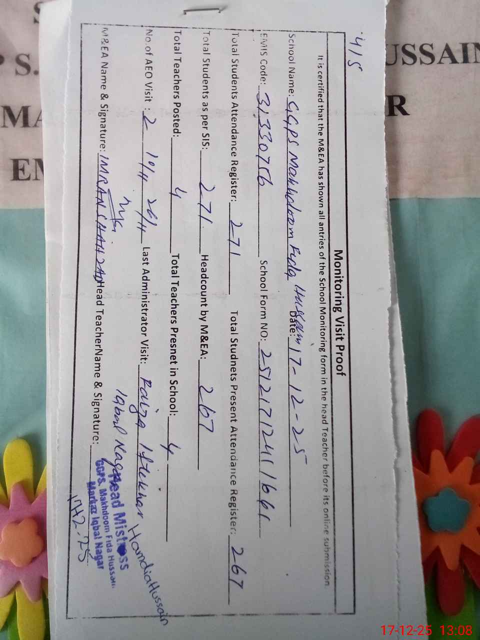 | Attendance Register | Head Teacher | MEA with School | Visit Proof |