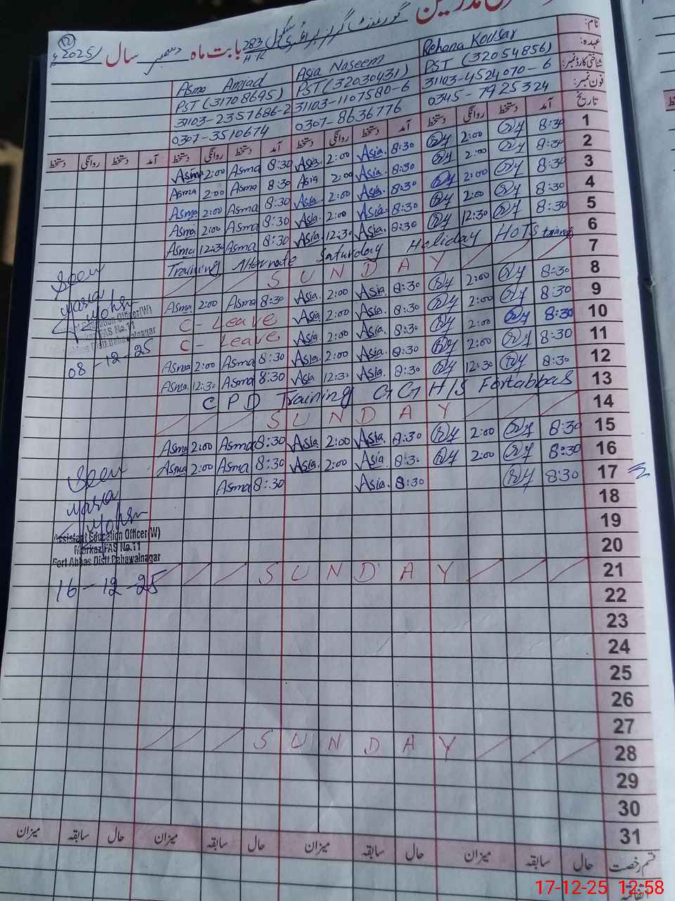| CNIC | Full Name | Designation | R/C | Absence during last cal. month |