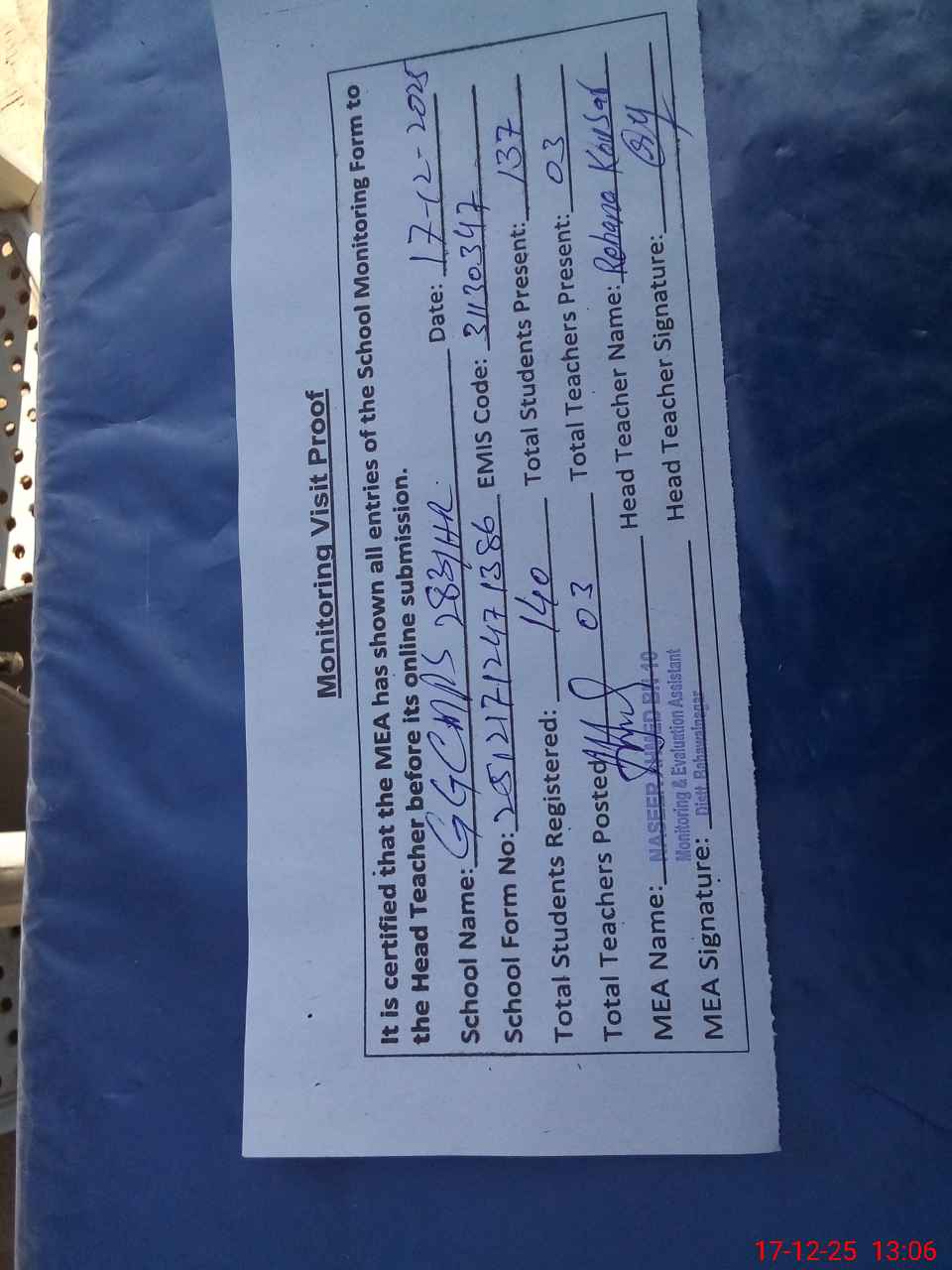 | Attendance Register | Head Teacher | MEA with School | Visit Proof |