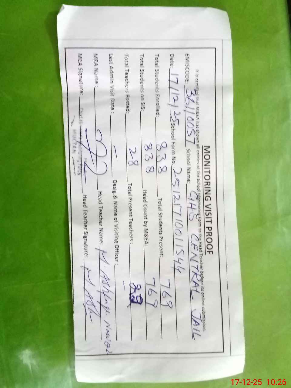 | Attendance Register | Head Teacher | MEA with School | Visit Proof |