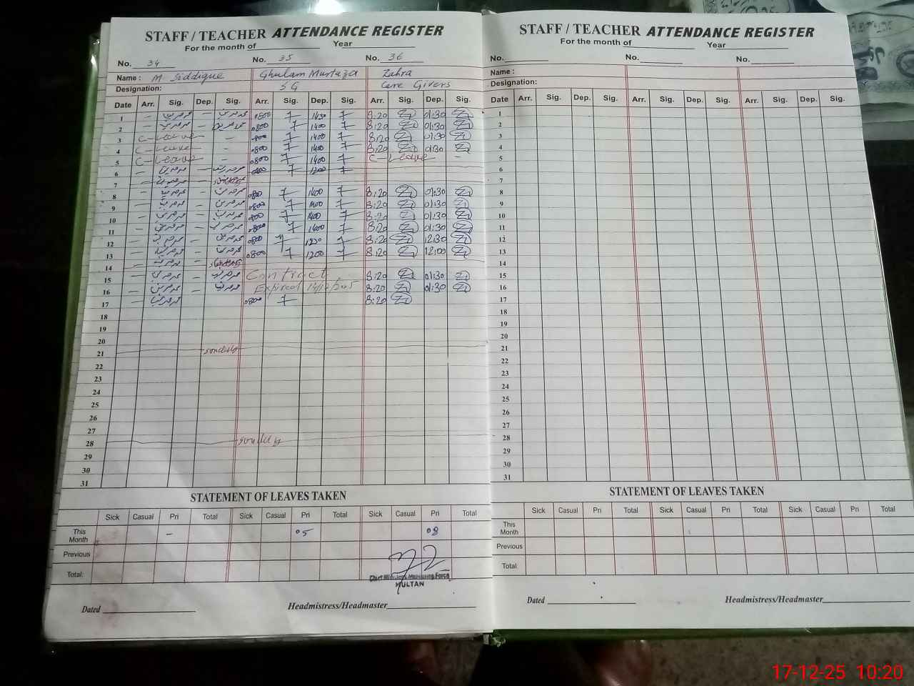 | CNIC | Full Name | Designation | R/C | Absence During Last Calender Month |
