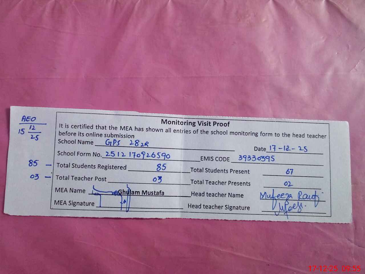 | Remarks (Use Separate Page if Required): Head Teacher is on casual leave therefore, the information/ data about NSB is not available so the column of NSB lying unfilled. Last visit by AEO on 15.12.2025 Both class rooms looking dangerous. | |||||