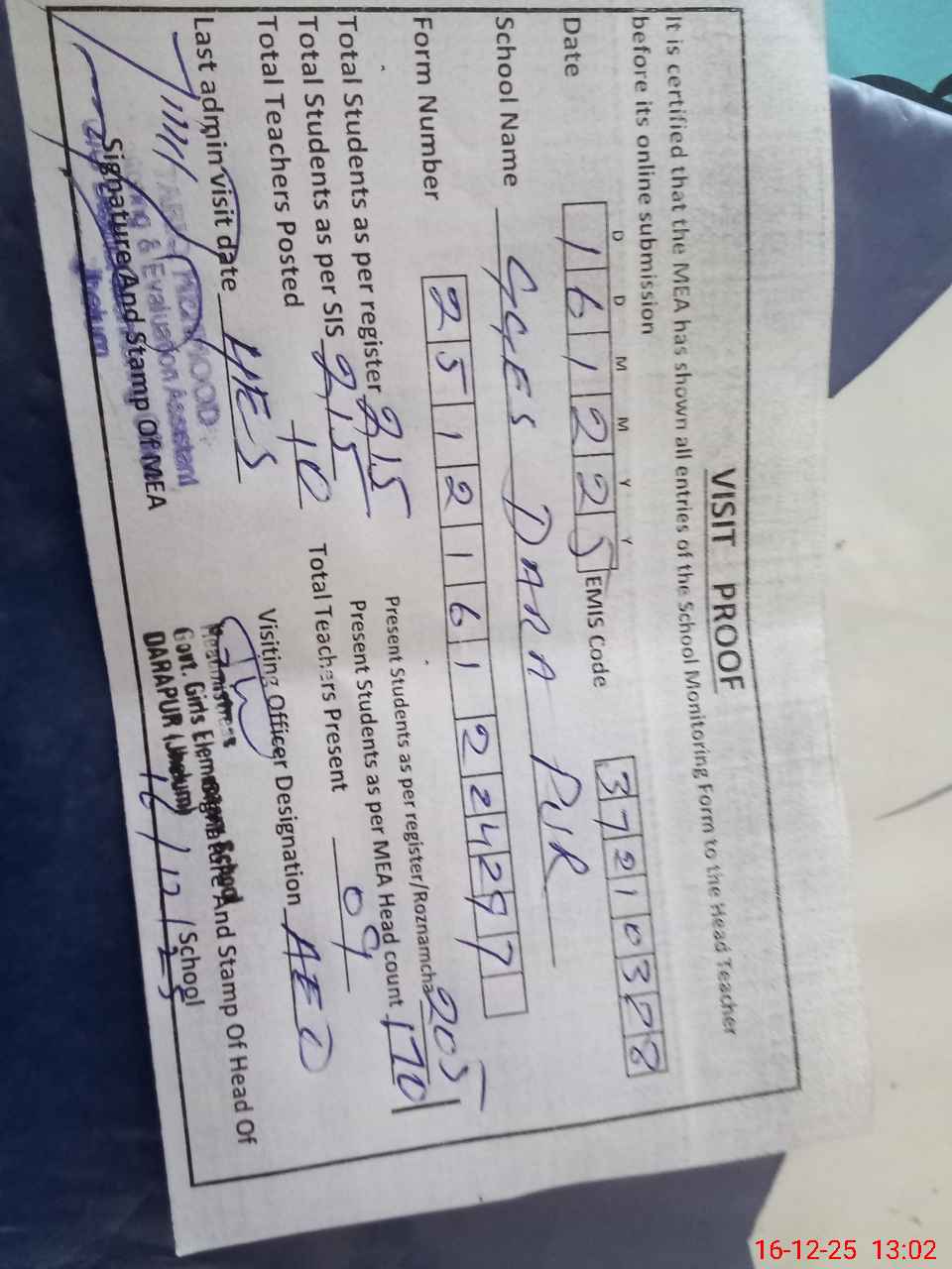 | Certified that this School was Inspected by the Undersigned MEA/DMO Today and the Information Stated Above is as Per Record. | |||||