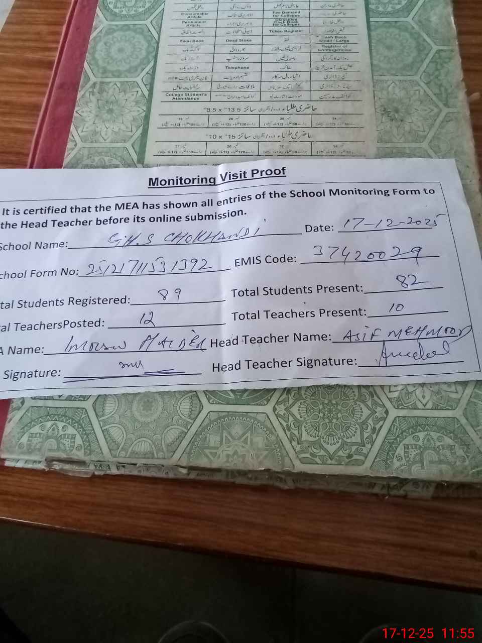 | Attendance Register | Head Teacher | MEA with School | Visit Proof |