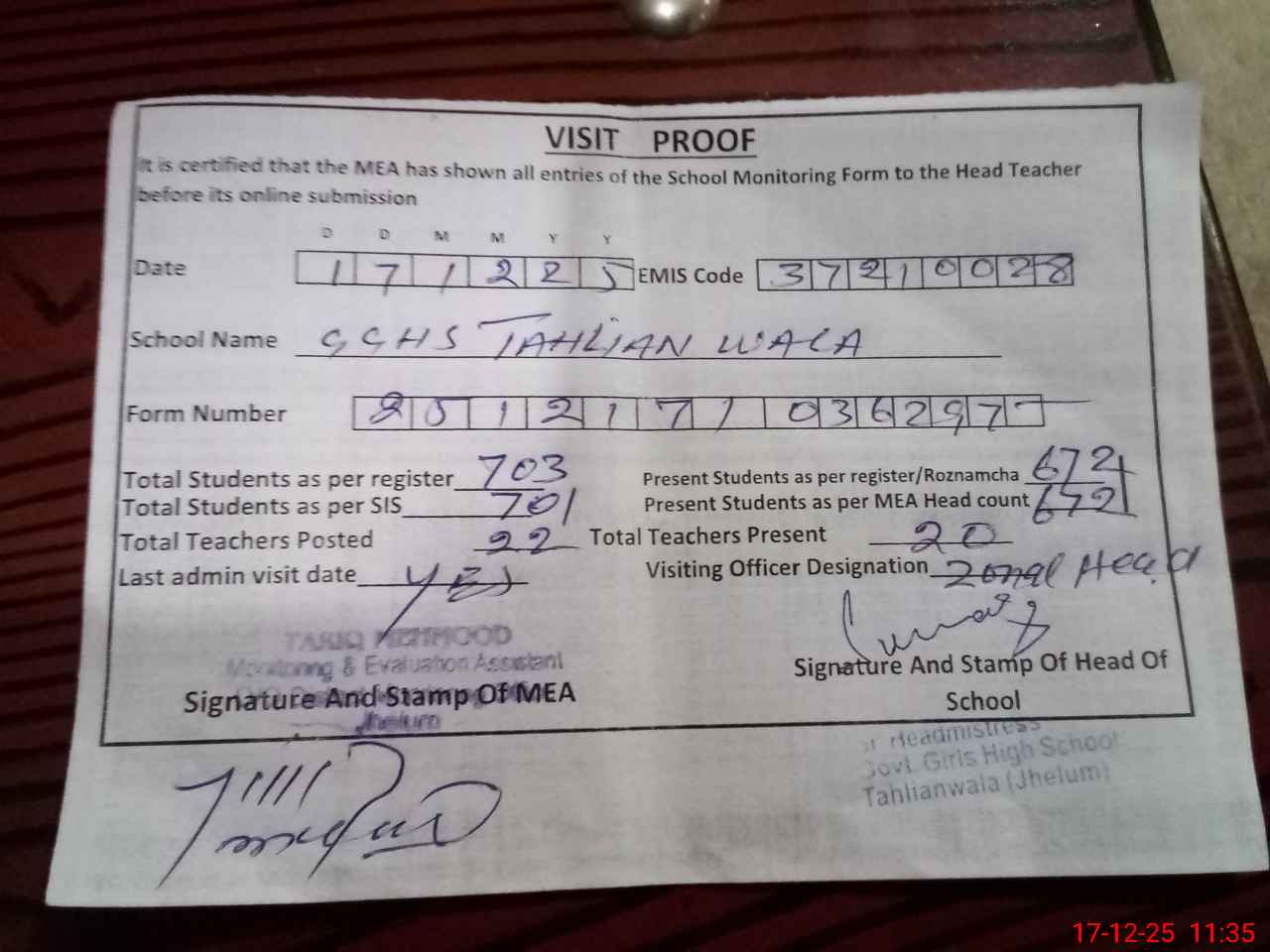 | EMIS Code: 37210028 | Name of School: GGHS TAHLIAN WALA | |||