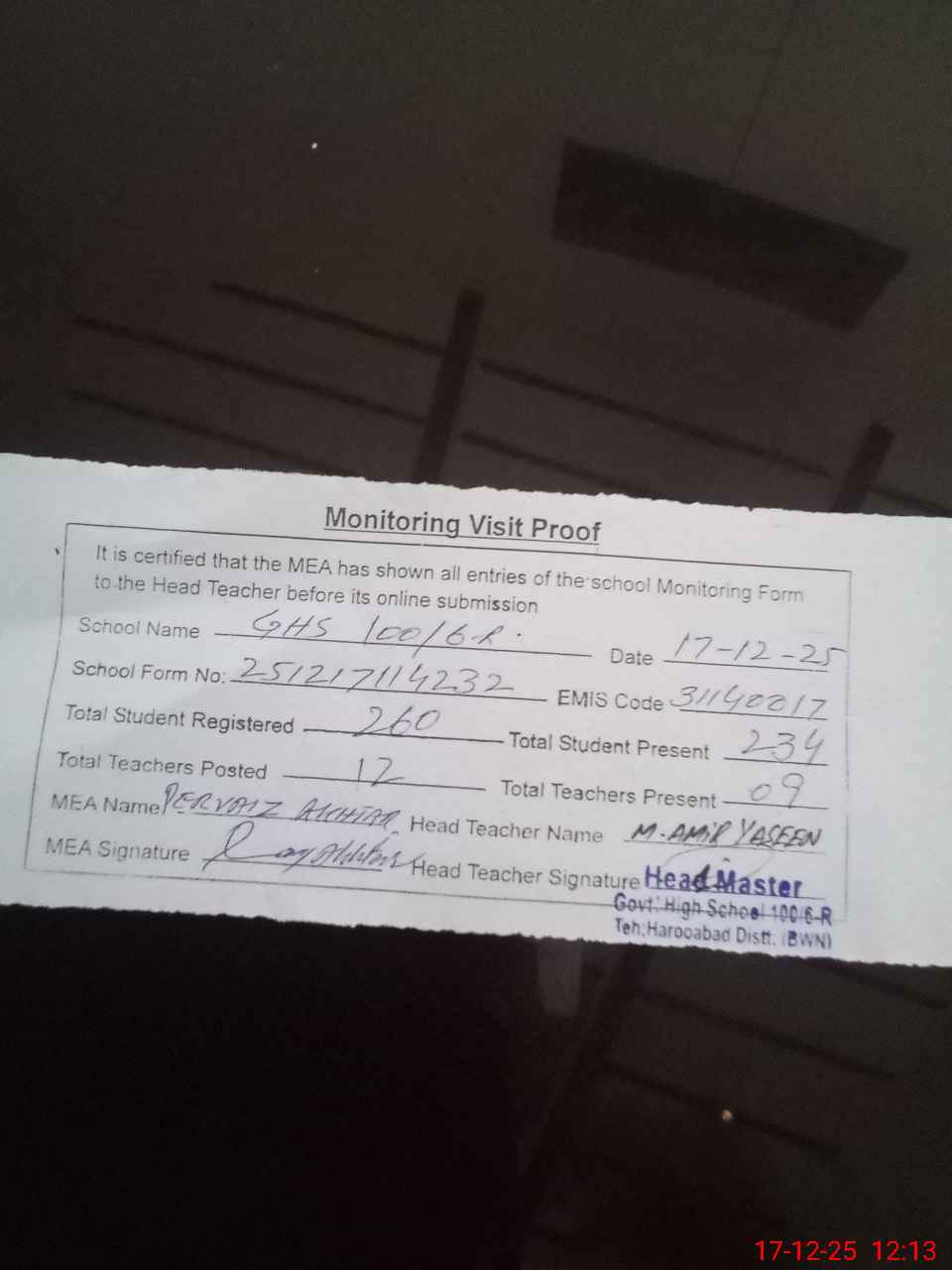 | EMIS Code: 31140017 | Name of School: GHS CHAK NO. 100/6-R | |||
