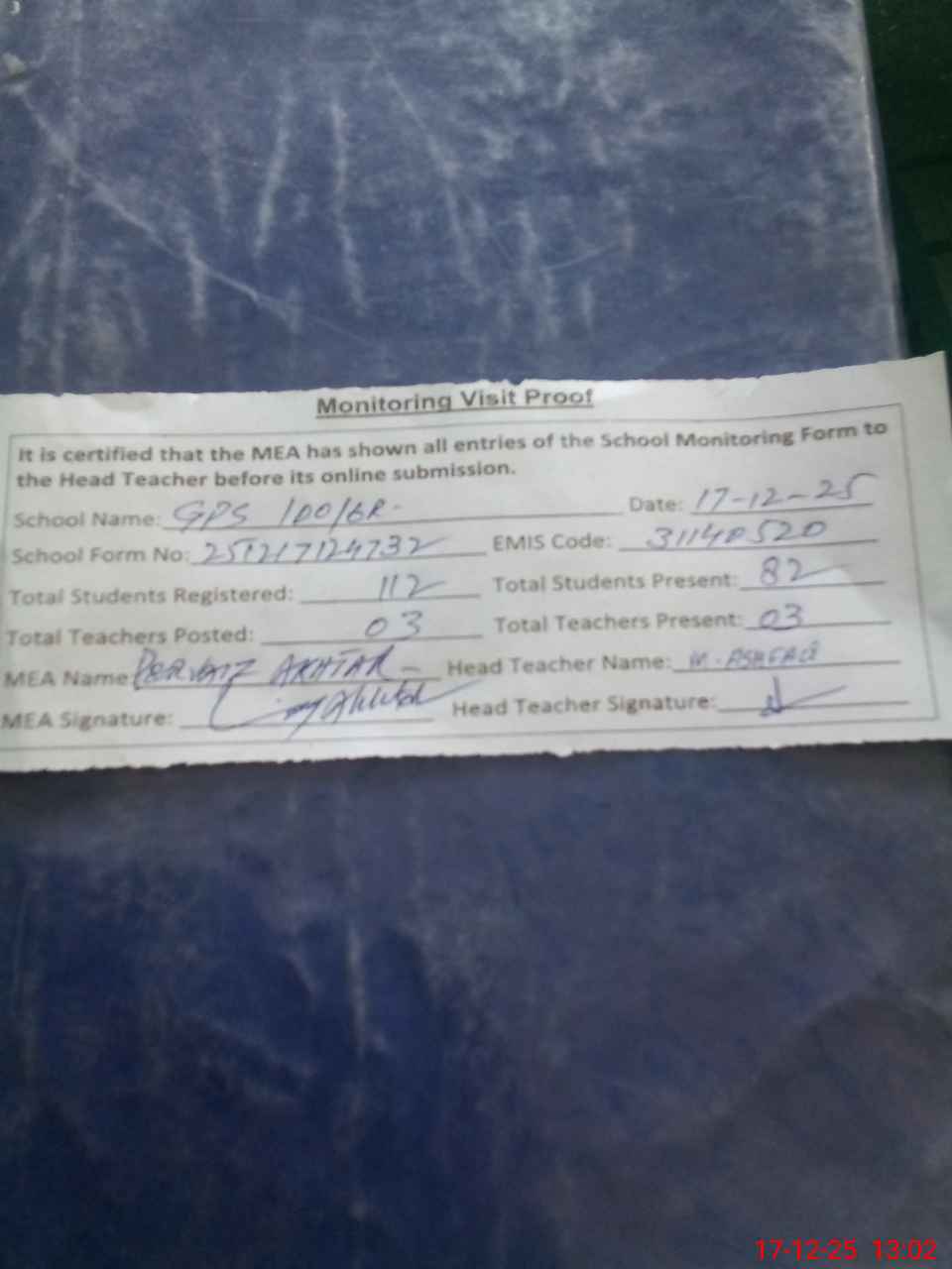 | Attendance Register | Head Teacher | MEA with School | Visit Proof |