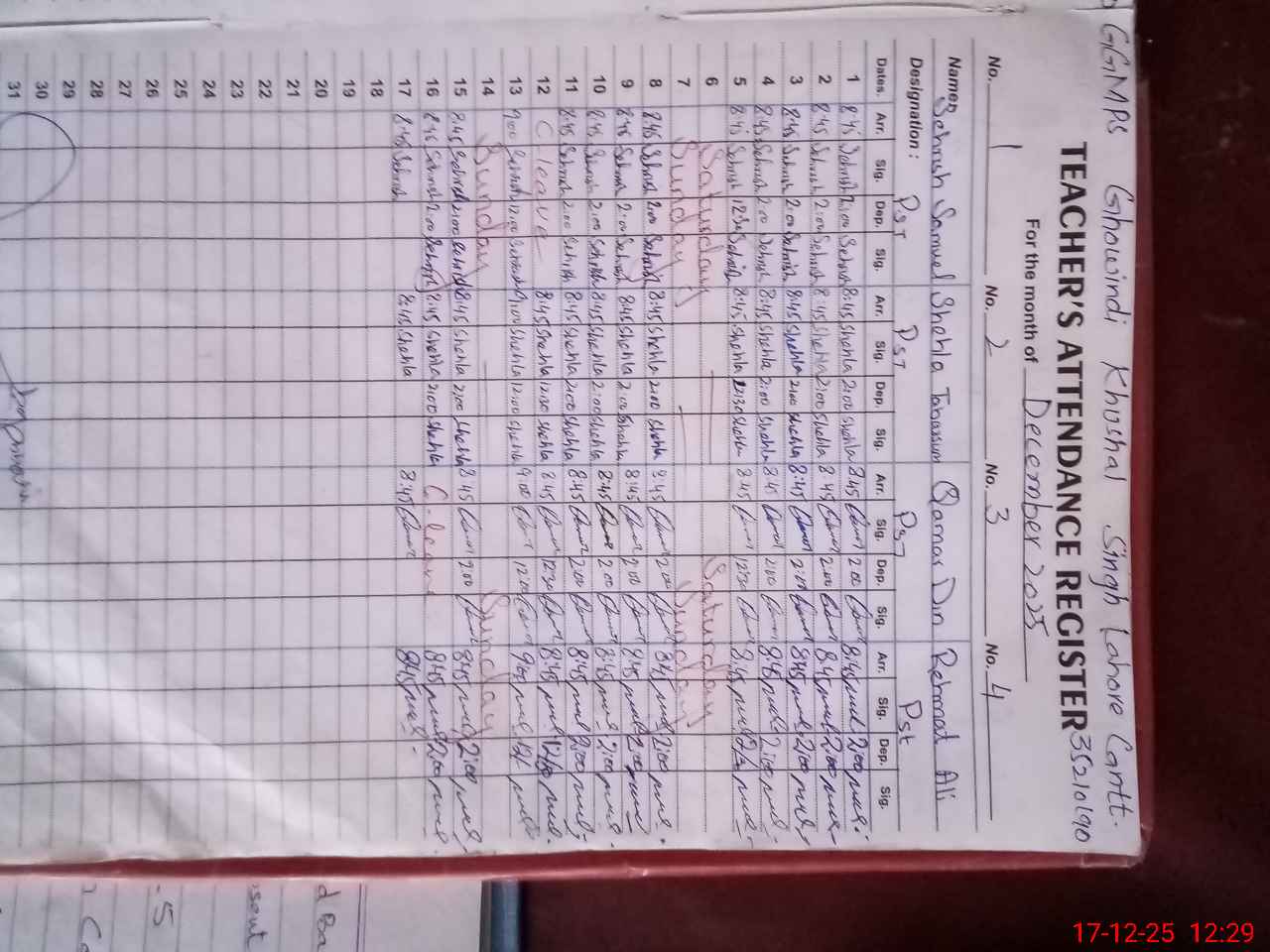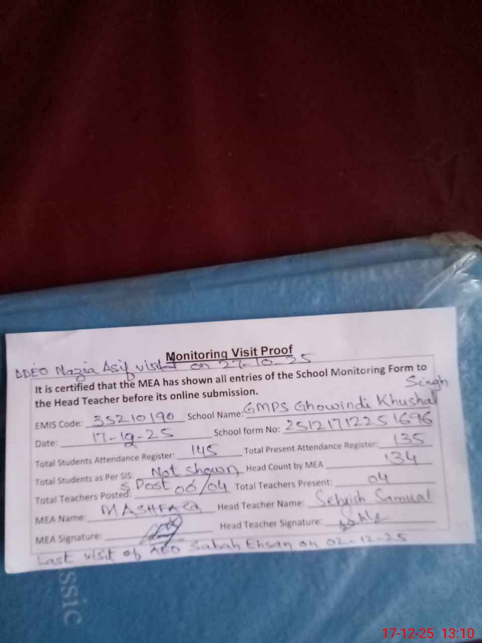 | Remarks (Use Separate Page if Required): Last visit of AEO Sabah Ehsan Abbasi on 02-12-25 DDEO Nazia Asif visited on 27-10-25 Naib Qasid Abdul Moiz on casual leave but his leave record not shown so mark him absent today 35210190 | |||||