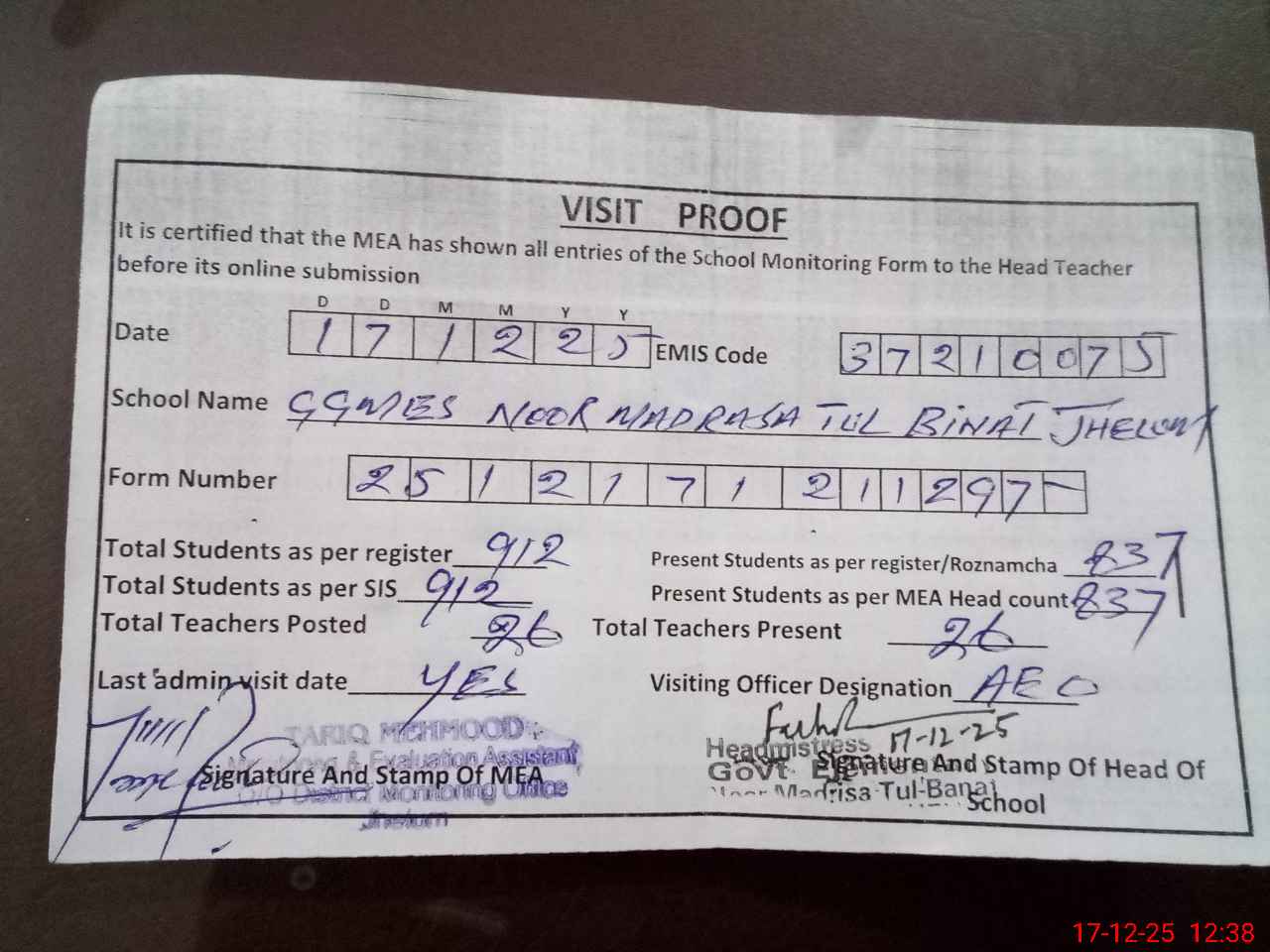 | EMIS Code: 37210075 | Name of School: GGMES NOOR MADRISA TUL BINAT JHELUM | |||