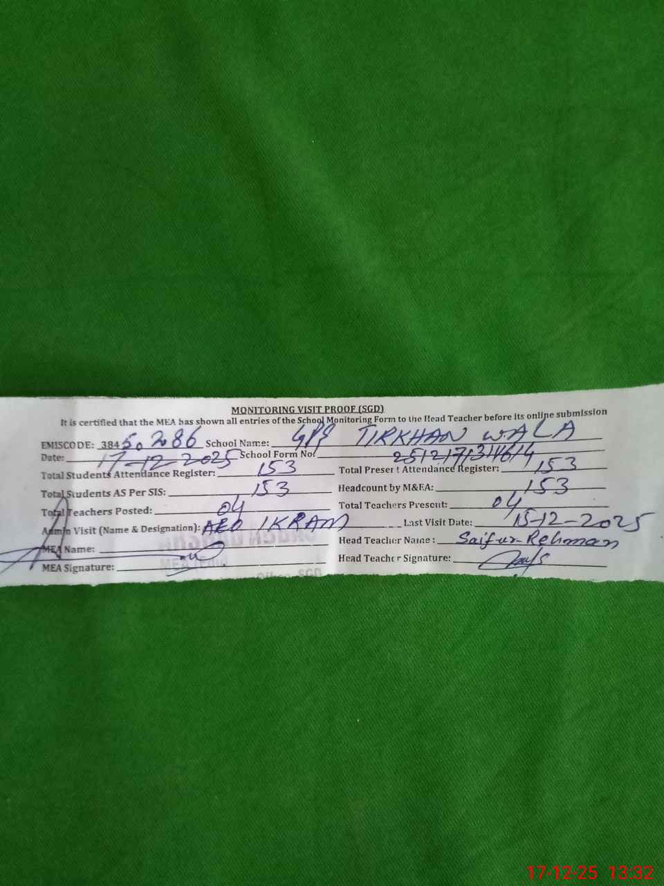 | Attendance Register | Head Teacher | MEA with School | Visit Proof |