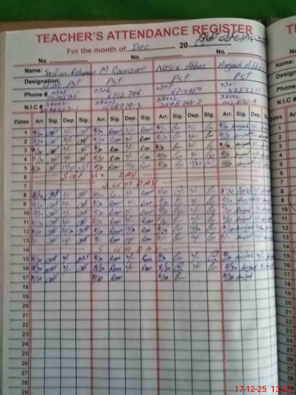 | CNIC | Full Name | Designation | R/C | Absence During Last Calender Month |