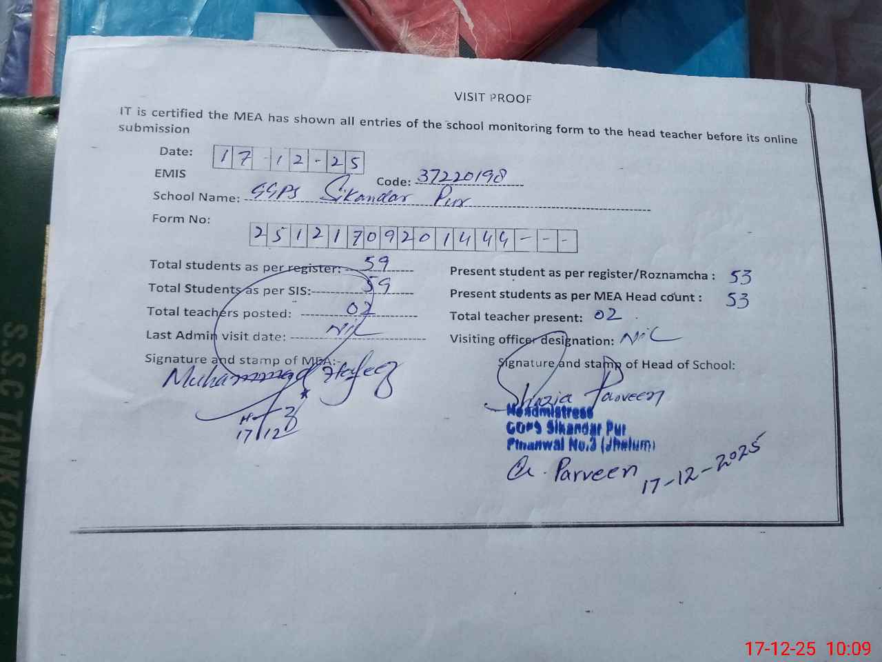 | Attendance Register | Head Teacher | MEA with School | Visit Proof |